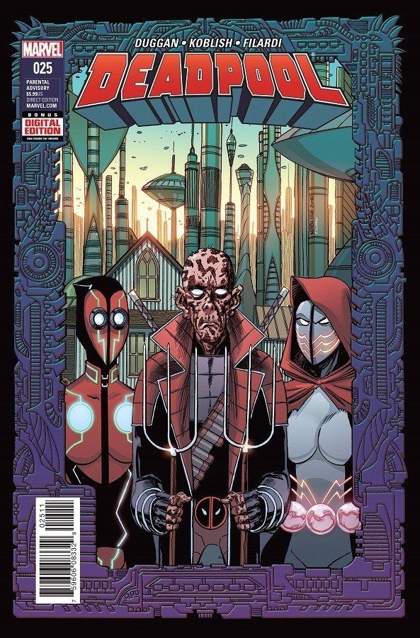 DEADPOOL 2099 reaches its DOUBLE-SIZED CONCLUSION! Wades two daughters battle for his legacy! PLUS: The old man himself gets in the game! AND: IRON FIST shows just how IMMORTAL he is! Parental Advisory