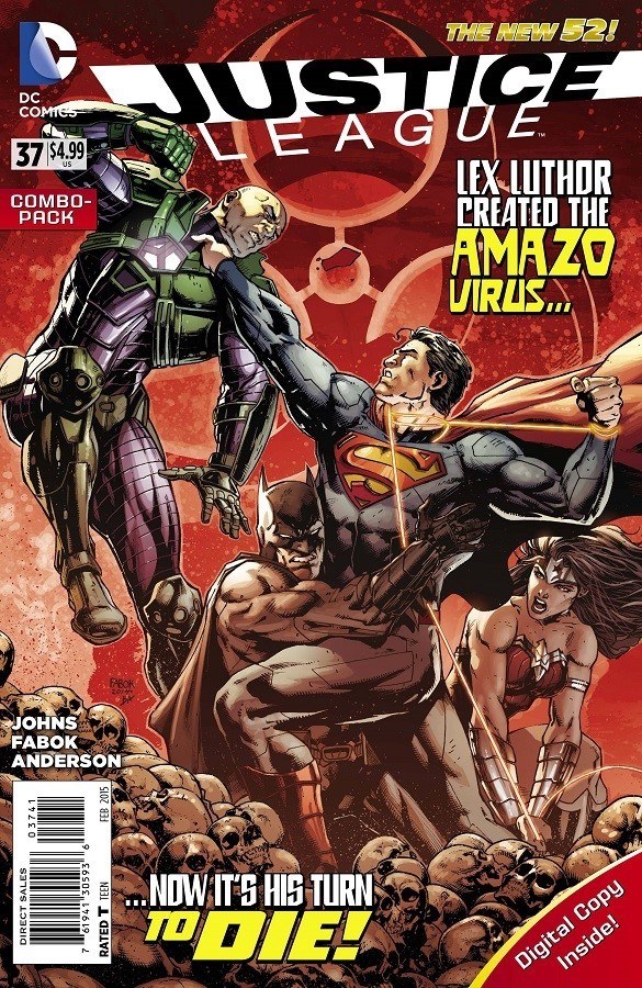 Super heroes are no more! What it means to be human is in question! The world is on the brink of a new stage of evolution - or total extinction! - and it's up to the Justice League to save it! 'THE AMAZO VIRUS' continues to devastate the Western World as Batman, Superman, Wonder Woman and Lex Luthor struggle to not only contain the virus, but cure those affected by it. But as they work against the clock, a legion of assassins is out for Lex Luthor's head. Will the Justice League protect Luthor...or the world? This issue is also offered as a combo pack edition with a redemption code for a digital download of this issue.