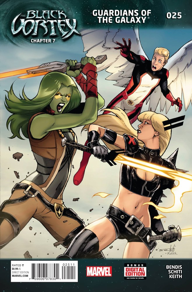 Chapter 7 of the BLACK VORTEX! Double-sizes spectacular! Rocket and Magik in action! Beast defeated and broken! Gamora on the offensive! Ronan deposed! Star-Lord defiant! Nova gives chase! This issue surely has it all! Rated T