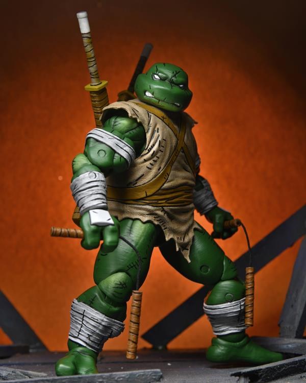Based on the original Eastman & Laird Teenage Mutant Ninja Turtles comic books from Mirage Studios, the Michelangelo (The Wanderer) action figure stands approximately 7 inches tall, and includes comic-authentic accessories such as swords, spear, kama, nunchucks, and extra hands. Comes in special comic-book themed window box packaging illustrated by Kevin Eastman.